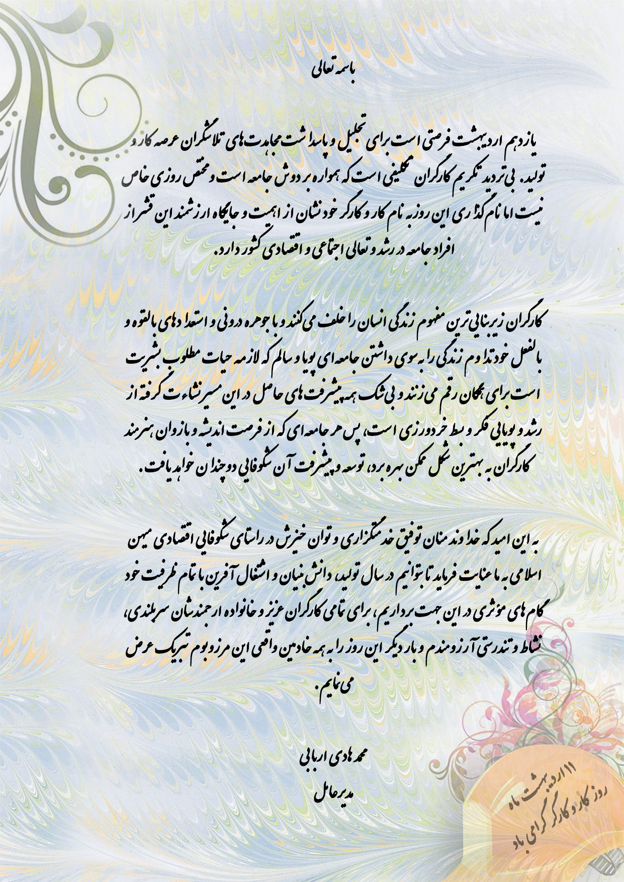 پیام تبریک مدیر عامل شرکت معدنی مواد نسوز بیرجند به مناسبت روز کار و کارگر